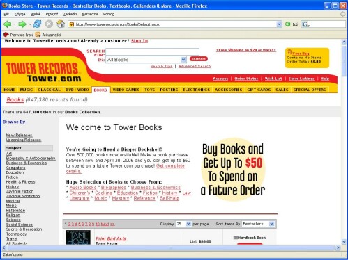 - Tower Records, amerykańska sieć sklepów znana przede wszystkim z bogatej oferty płyt muzycznych z nagraniami od rocka i nowych trendów po klasykę muzyki poważnej, otworzyła swoją nową księgarnię internetową na stronie www.towerrecords.com. W ofercie znajduje się ponad 500 000 tytułów książkowych. Firma zamierza wprowadzić książki również do swoich tradycyjnych punktów handlowych.
