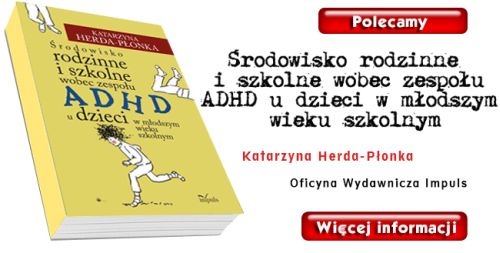 Polecamy kolejną publikację związaną z tematyką ADHD pt.: Środowisko rodzinne i szkolne wobec zespołu ADHD u dzieci w młodszym wieku szkolnym autorstwa Katarzyny Herda-Płonka.