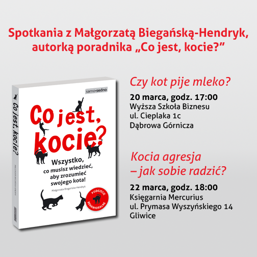 Wydawca serii Samo Sedno wraz z Małgorzatą Biegańską-Hendryk serdecznie zapraszają wszystkich miłośników i opiekunów kotów na spotkania poświęcone kociej tematyce: wykłady „Czy kot pije mleko?” w Dąbrowie Górniczej oraz „Kocia agresja – jak sobie radzić?” w Gliwicach.
