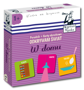 Odkrywam świat. W domu to wygodny zestaw do zabawy i nauki nazw przedmiotów z najbliższego otoczenia przeznaczony dla maluchów już od 1. roku życia. W pudełeczku znajduje się 17 sztywnych, dwustronnych kart spiętych rozpinaną śrubą oraz dwustronna książeczka z poradnikiem dla opiekunów i zadaniami dla dzieci.
