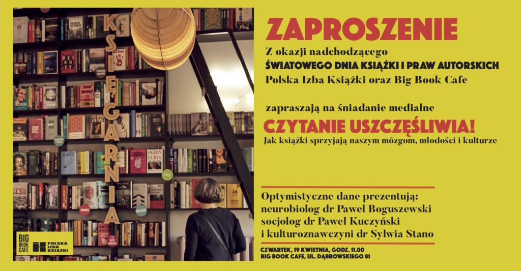 Spotkanie “Czytanie uszczęśliwia! Jak książki sprzyjają naszym mózgom, młodości i kulturze” odbędzie się 19 kwietnia, o godzinie 11.00 w klubokawiarni Big Book Cafe, przy ul. Dąbrowskiego 81.