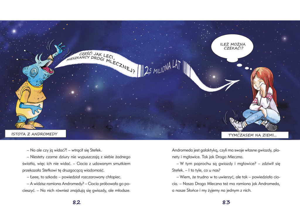 Wystarczy znaleźć się z dala od miejskich świateł, by móc obserwować niebo. Stefek i Basia mają okazję to robić w towarzystwie cioci astronomki. Uczą się rozpoznawać gwiazdozbiory, dowiadują się, czym jest światło, obserwują planety, mgławice i galaktyki przez teleskop. Śledząc przygody bohaterów, czytelnik dowie się, jak wielki jest kosmos, czym są gwiazdy, jak powstają planety, jak wygląda Układ Słoneczny, jak działa teleskop, czym są pory roku. Doskonałe wprowadzenie do wiedzy o Wszechświecie.