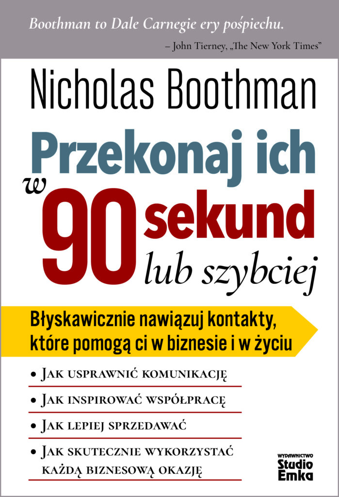 Nick Boothman znakomicie doradza, jak sprawić, by w ciągu 90 sekund od spotkania swego rozmówcy móc komunikować się z nim jak ze starym zaufanym przyjacielem. […] A następnie skutecznie przekształcić te kontakty w trwałe i efektywne relacje biznesowe.