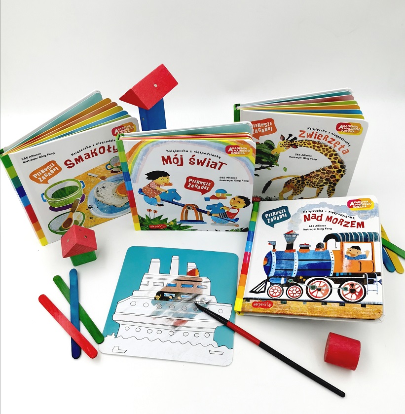 Wybór czterech tytułów z prostymi, angażującymi zagadkami dla najmłodszych i niespodzianką za prawidłowe ich rozwiązanie – „Nad morzem”, „Mój świat”, „Zwierzęta” i „Smakołyki”. Książeczki pomagają ćwiczyć wyobraźnię i uczą abstrakcyjnego myślenia. Zachęcają do szukania związków przyczynowo – skutkowych. W każdej pozycji dziecko znajdzie 5 dużych ilustracji. Strony są złożone na czworo, a maluch stopniowo odsłania fragmenty obrazka i poznaje podpowiedzi, ćwicząc przy tym sprawność dłoni i palców. Na końcu ukryto różne niespodzianki – puzzle, kolorowankę wodną wielokrotnego użytku, a nawet lusterko!