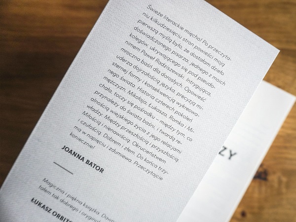 Po przeczytaniu kilkudziesięciu stron powieści moją pierwszą myślą było, że dostałam dzieło doświadczonego pisarza, jednego z moich kolegów, ukrywającego się pod pseudonimem: Paweł Radziszewski. Opowieść uderza dojrzałością języka, precyzją misternej formy i konsekwencją wykreowanego świata. Historia czterech pokoleń mężczyzn, Mikołaja, Łukasza, Romana i Michała, toczy się pośrodku – między tym, co przynależy do świata baśni i twardą realnością wiejskiego życia z jego relacjami władzy. Między przeszłością i przyszłością. Miłością i nienawiścią. Okrucieństwem i czułością. Dobrem i złem. Do końca trzyma w napięciu i zdumiewa. Świeże literackie mięcho!