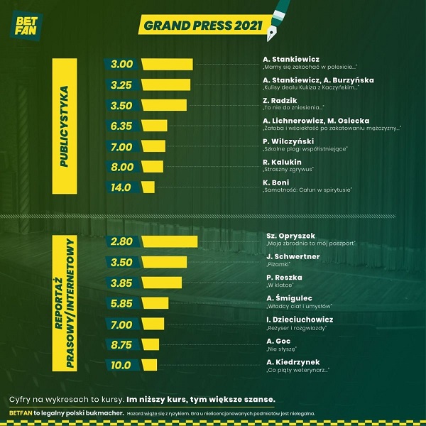 Grand Press to jeden z najbardziej prestiżowych konkursów dziennikarskich w Polsce. Organizują go magazyn Press i Fundacja Grand Press. Według BETFAN najważniejsza nagroda, Dziennikarz Roku, trafi tym razem do Andrzeja Poczobuta. To urodzony na Białorusi dziennikarz i publicysta, korespondent Gazety Wyborczej oraz działacz mniejszości polskiej na Białorusi, który w marcu 2021 r. został po raz kolejny uwięziony przez białoruski reżim. Inni nieformalni kandydaci do tytułu Dziennikarza Roku, zdaniem BETFAN, mają dużo mniejsze szanse niż faworyt, choć konkurencję stanowi tu silna reprezentacja z tytułów Ringier Axel Springer Polska. Drugi w notowaniach bukmachera jest Janusz Schwertner (Onet), a za nim są, ex aequo, Agnieszka Burzyńska (Fakt) i Andrzej Stankiewicz (Onet).