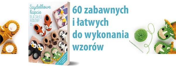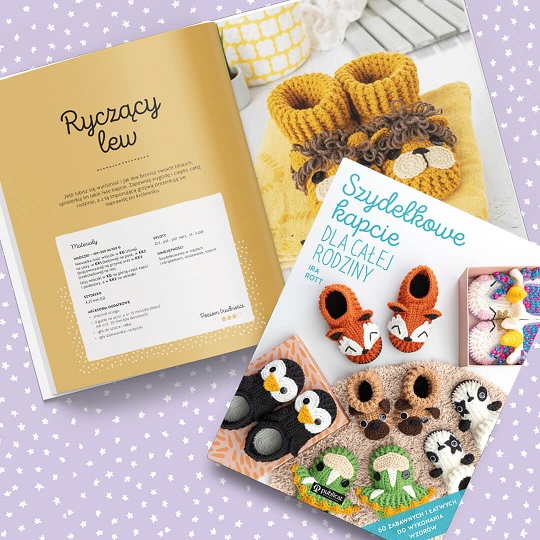 Wydziergaj urocze i wygodne kapcie dla całej rodziny. Najpierw zdecyduj, który z modeli będzie najbardziej odpowiedni: wsuwane klapki, standardowe pantofle czy wysokie bambosze za kostkę. Następnie dopasuj rozmiar (dla dziecka lub dla dorosłego), co ułatwi miarka na skrzydełku książki. Na koniec wybierz jeden z 20 zwierzęcych motywów: dzielnego dinozaura, wesołego pingwina, psotnego szopa, słodkiego słonika lub magicznego jednorożca.