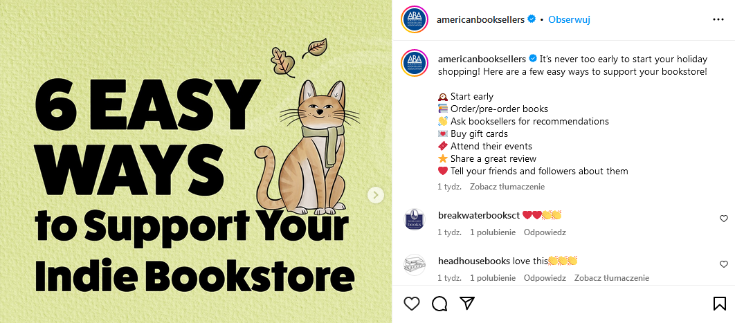 “6 easy ways to Support Your Indie Bookstore” to poradnik American Booksellers Association, które Stowarzyszenie zamieściło w połowie września br. na swoim Instagramie.