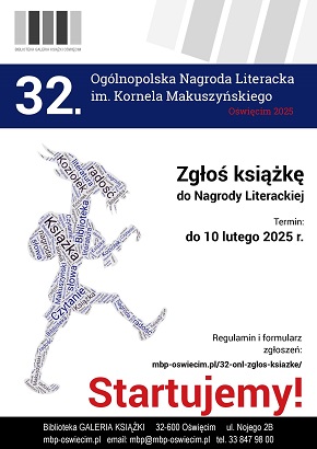 Do 10 lutego 2025 r.przyjmowane są zgłoszenia publikacji do 32. Ogólnopolskiej Nagrody Literackiej im. Kornela Makuszyńskiego. Oświęcim 2025 (decyduje data stempla pocztowego).