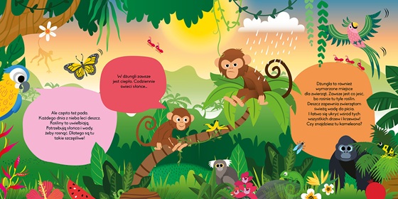 Kto z was ma ochotę na wyprawę do dżungli i wnikliwe obserwowanie niesamowitych roślin, jakie tam rosną, i egzotycznych zwierząt, jakie tam żyją?… Och, jak wielu chętnych! To wspaniale, że jesteście zainteresowani, bo ta pomysłowa książka, wyposażona w latarkę, umożliwi wszystkim małym podróżnikom eksplorowanie nawet najbardziej tajemniczych zakątków lasów tropikalnych.